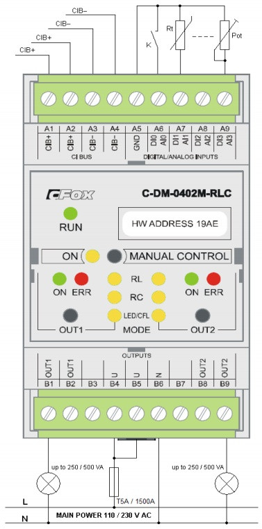 • Модуль із 2 незалежними виходами (каналами) пропорційного керування джерел світла з напруги мережі 230 В змінного струму.
